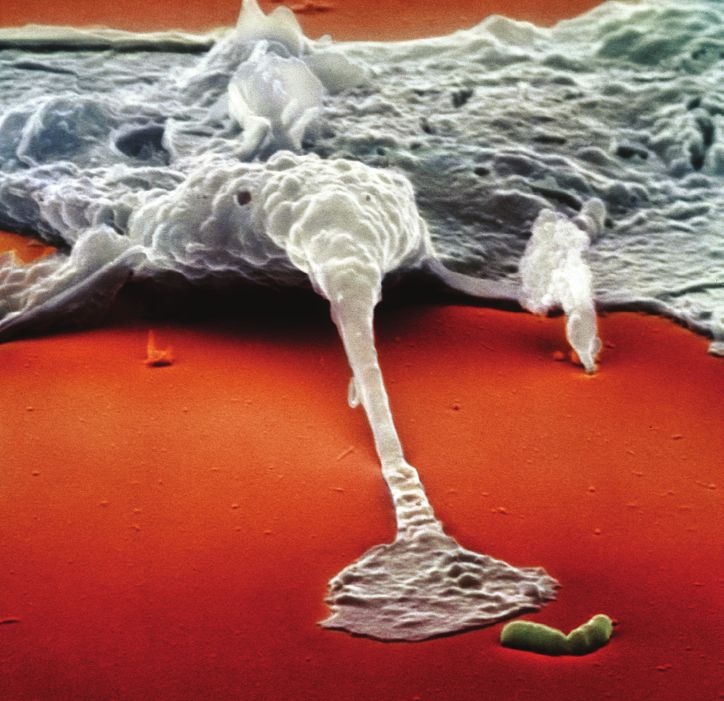 Macrophages are mainly positioned where the human body is exposed to the outside world. They reside under the skin to protect against invading microbes (e.g., as a result of a wound or a burn). They are also in our lungs to fight microbes coming from the air we inhale. They are also present in the intestines to defend us against ingested microbes. The electron micrograph below shows a macrophage extending an arm to grab a bacterium.